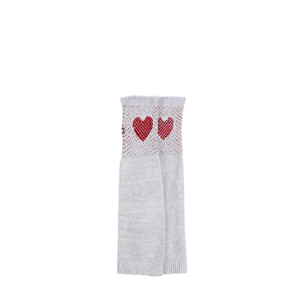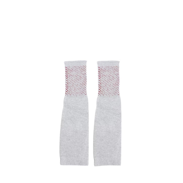 A pair of grey and red printed UV protection arm gloves, has a ribbed hem and cutout for the thumb